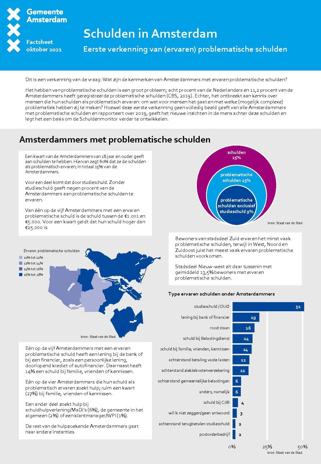 Deze factsheet kijkt in het kort naar Amsterdammers met problematische schulden. Problematische schulden kunnen iedereen raken, mannen en vrouwen ervaren de problemen in gelijke mate en iets vaker jongeren. Na een middelbare opleiding ervaart men wat vaker een problematische schuld. Een lager inkomen zorgt vaker voor een ervaren schuld. Wanneer we kijken naar de belangrijkste bron van inkomsten van mensen met problematisch ervaren schulden dan zien we vaak dat dit een uitkering is.