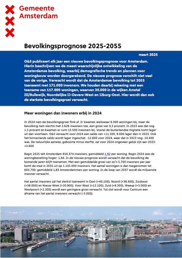 O&S publiceert elk jaar een nieuwe bevolkingsprognose voor Amsterdam. Hierin beschrijven we de meest waarschijnlijke ontwikkeling van de Amsterdamse bevolking, waarbij demografische trends en plannen voor woningbouw worden doorgerekend.