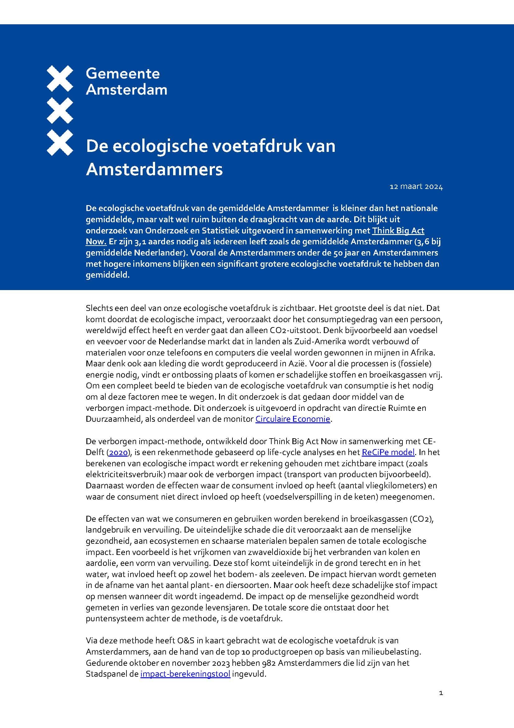 De voetafdruk van de gemiddelde Amsterdammer is berekend in samenwerking met Think Big Act Now aan de hand van de verborgen impact-methode. Met die methode kan de totale ecologische impact van een consumptiepatroon worden berekend. Voor dit onderzoek hebben 982 Amsterdammers in oktober en november 2023 de impact-berekeningstool ingevuld.