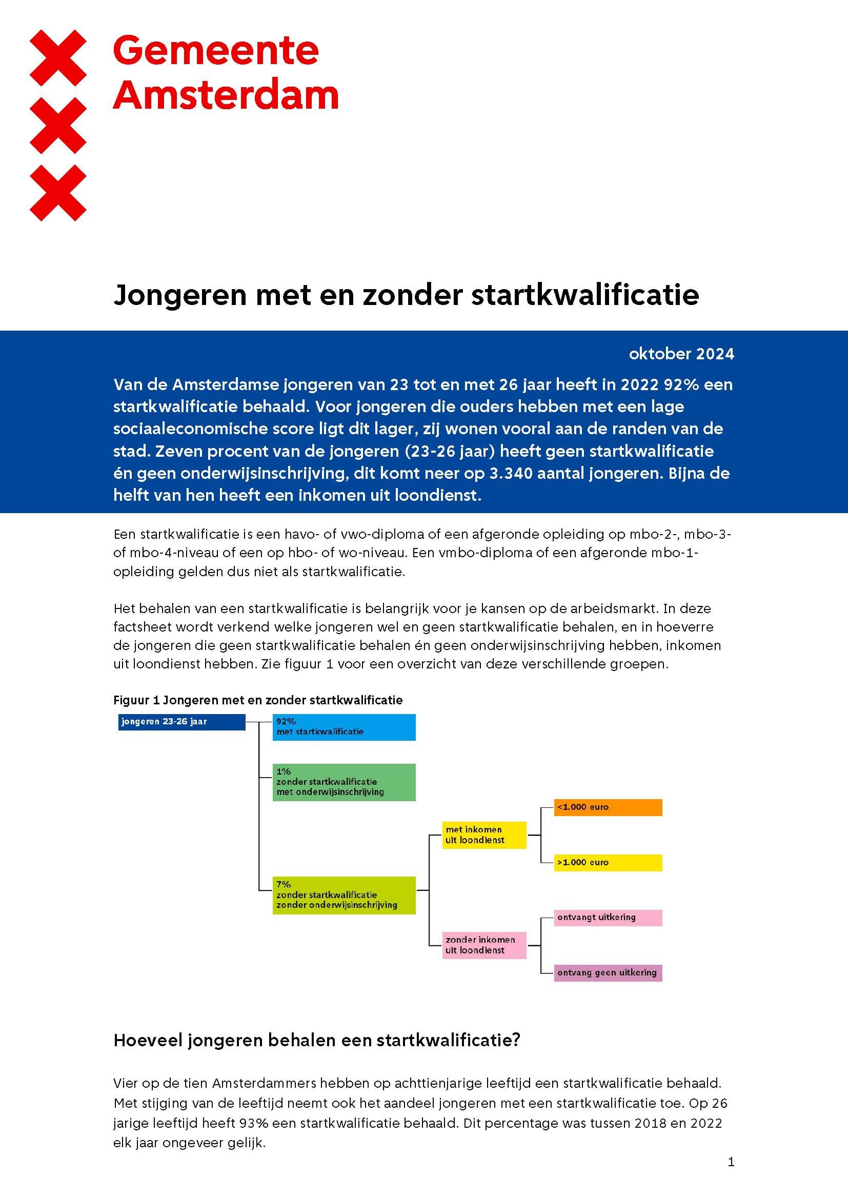 Van de Amsterdamse jongeren van 23 tot en met 26 jaar had 92 procent in 2022 een startkwalificatie. Dat aandeel ligt onder jongeren die ouders hebben met een lage sociaaleconomische score lager. 7 procent van de jongeren heeft geen startkwalificatie én geen onderwijsinschrijving. Ongeveer de helft van hen heeft een inkomen uit loondienst.