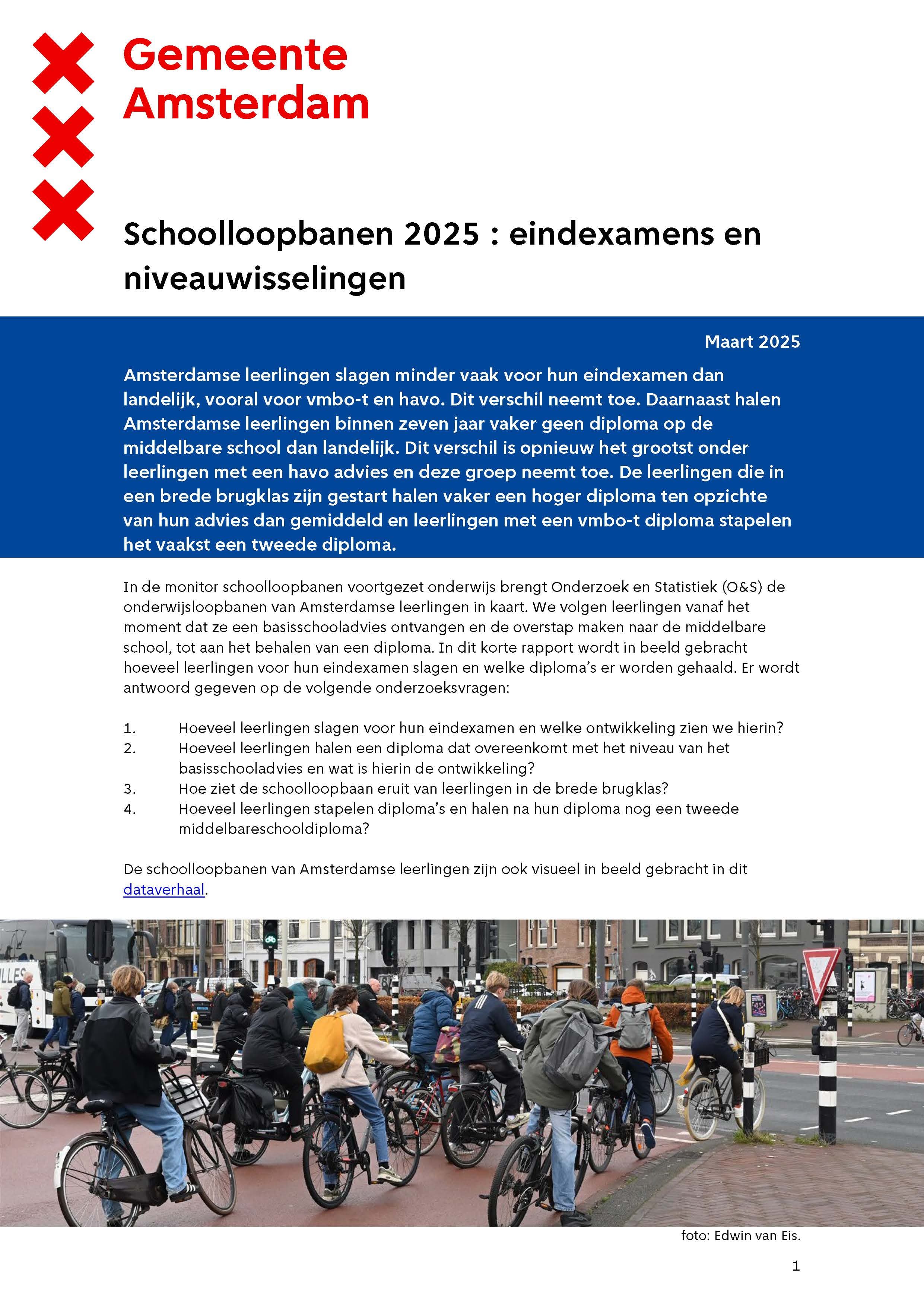 Amsterdamse leerlingen slagen minder vaak voor hun eindexamen dan landelijk, vooral voor vmbo-t en havo. Dit verschil neemt toe. Daarnaast halen leerlingen in Amsterdam binnen zeven jaar vaker geen diploma dan gemiddeld in Nederland. Het verschil tussen Amsterdam en Nederland is het grootst onder leerlingen met een havo-advies. Ook groeit deze groep. De leerlingen die in een brede brugklas zijn gestart, halen vaker een hoger diploma ten opzichte van hun advies dan gemiddeld. Leerlingen met een vmbo-t-diploma stapelen het vaakst een tweede diploma.